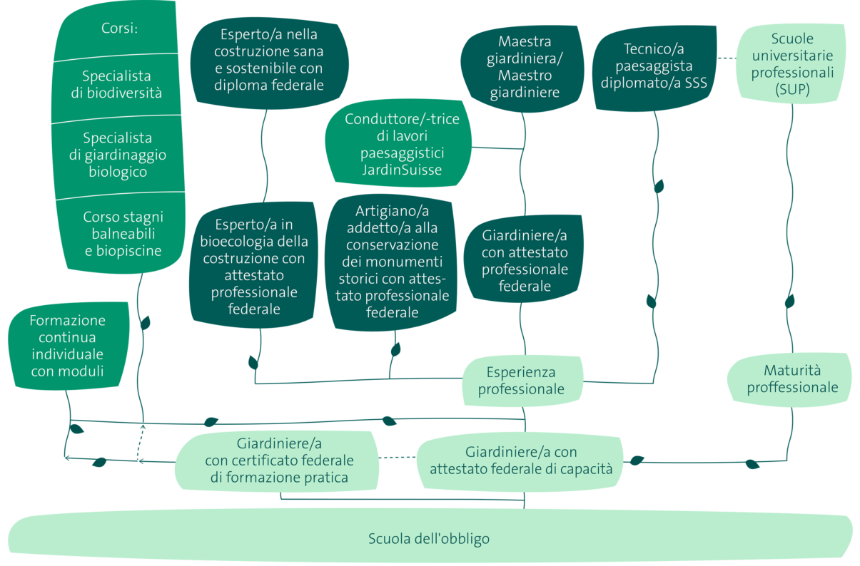 Un sistema educativo permeabile Tutto ciò che serve per crescere professionalmente Volete fare carriera nel settore del verde? Noi di JardinSuisse ne siamo molto felici! E noi siamo felici di sostenervi. Qui troverete tutte le opportunità aperte a voi come giardinieri nel campo della formazione continua.